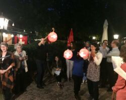 Nach der Begrüssung durch den Präsidenten des Vereins und einer kurzen Ansprache unserer neuen Botschaftsrätin Stefanie Diame wurde das Buffet eröffnet. Trotz oder vielleicht gerade wegen des „full house“ war die Stimmung unter den Mitgliedern ausgezeichnet. Mit Einbruch der Dunkelheit kamen unsere Kleinen an die Reihe: Die Kerzen der Lampions wurden angezündet und im Schein der Lampions sangen die Erwachsenen mit mehr oder weniger Mühe, aber doch erkennbar, den Schweizerpsalm und „Le vieux Chalet“. Dies war dann für die ersten Gäste das Zeichen zum Aufbruch, doch die letzten ließen sich noch ausgiebig Zeit….