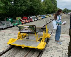 Am Sonntag, 19. September 2021, fand sich eine gemischte Gruppe unserer Gesellschaft im Mittelburgenland zusammen, um – geführt von unserem Vizepräsidenten Stephan Dubach und unter tatkräftiger Mitwirkung unserer Ehrenpräsidentin Anita Gut – eine “Draisinentour” auf einer alten Bahnstrecke mit insgesamt rund 23 km Länge zu absolvieren. Die Draisinentour startete mit 4 Draisinen (= 16 Personen) in Oberpullendorf und führte durch eine landschaftlich reizvolle Gegend mit Weingärten, Sonnenblumenfeldern und schattigen Wäldern, an romantischen Dörfern vorbei bis zum Ziel in Neckenmarkt/Horitschon. Weil sich das “Treten” zur Fortbewegung der Draisinen als durchaus anstrengend erwies, wurde zur Stärkung eine Rast in einem gemütlichen Gasthof an der Bahnstrecke gemacht. Auch das Wetter spielte mit, wurde es für Alle nicht nur eine sportliche, sondern auch vergnügliche Tour.