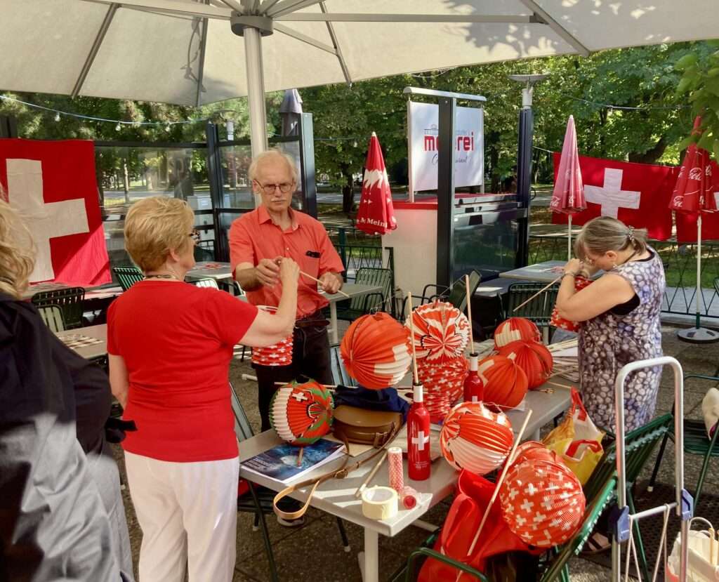 Es war die letzten Male so stimmungsvoll, dass wir uns entschlossen haben, unsere Bundesfeier am Donnerstag, 1. August 2024, nochmals beim Heurigen “Schübel-Auer” in Nussdorf abzuhalten. Nach dem Apéro, dankenswerterweise gespendet von der Schweizerischen Botschaft, konnte Präsident Ivo Dürr mehr als 100 Mitglieder, Gäste und Freundinnen und Freunde der Schweiz im romantischen, schattigen Garten des Schübel-Auer begrüßen, darunter die Schweizerische Botschafterin, i.E. Salome Meyer, die auch die 1. August-Ansprache hielt. Besonders erfreulich war die Präsenz vieler junger Leute, Familien und Kinder und auch einiger neuer Mitglieder. Nach dem offiziellen Teil fand das reichhaltige Buffet regen Zuspruch und sorgte, zusammen mit dem romantische Ambiente für ausgezeichnete Stimmung unter den Gästen. Mit Einbruch der Dämmerung wurden die Lampions für die Kinder angezündet und gemeinsam der obligate “Schweizerpsalm” und “Le Vieux Chalet” gesungen. Es war eine in jeder Hinsicht gelungene und fröhliche 1. Augustfeier, nur sollten wir für die 1. Augustfeier 2025 vielleicht vorher noch ein Gesangs-Training einplanen.