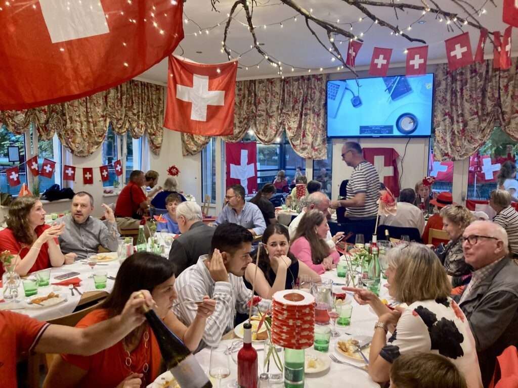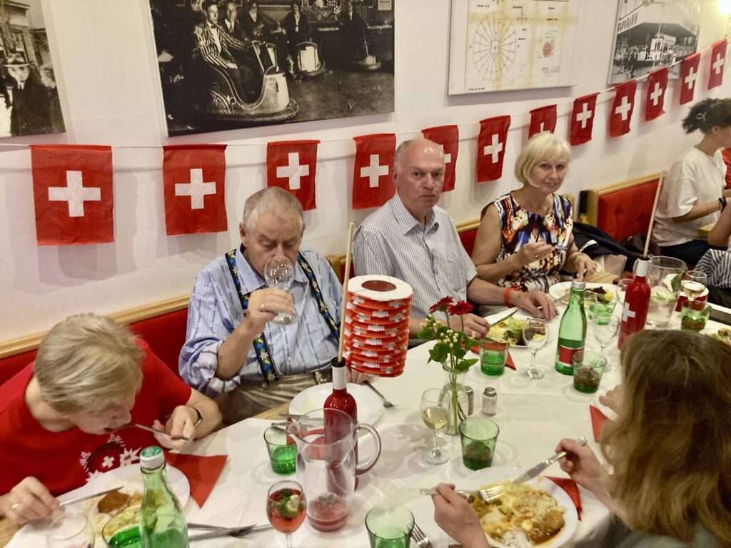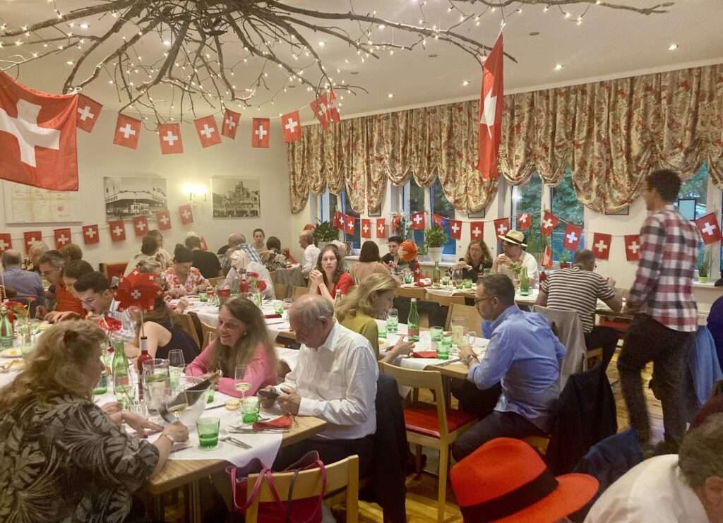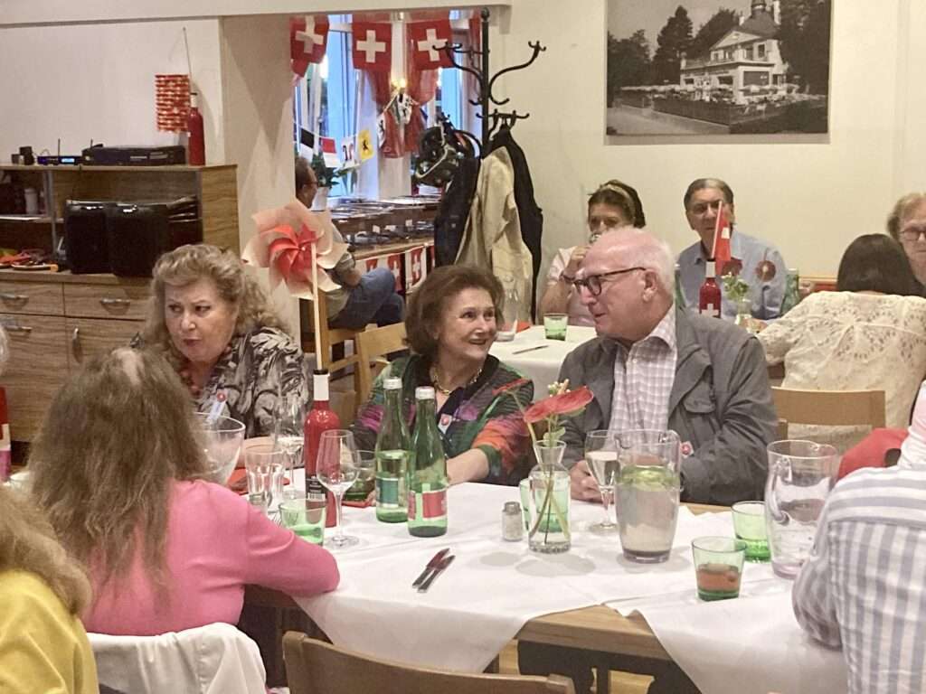 Die 1. Augustfeier, diesmal abgehalten in der Meierei im Prater, erwies sich als Volltreffer: Über 110 grosse (und kleine) Mitglieder und Gäste fanden sich im Lokal ein. Organisatorisch war es etwas herausfordernd, weil sich rund ein Drittel der Gäste erst nach dem Anmeldeschluss und teilweise erst wenige Tage bis Stunden (!) vor der Veranstaltung meldeten. Weil das Wetter unbeständig war und jederzeit mit einem Regenschauer gerechnet werden musste, wurde im schweizerisch dekorierten grossen Saal des Restaurants aufgetischt. Mit etwas Improvisationskunst fanden dort schlussendlich alle Mitglieder einen Platz.