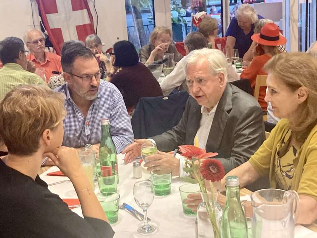 Die 1. Augustfeier 2022 wurde, wie schon 2021, beim Heurigen Schübel-Auer in Nussdorf abgehalten, auch aufgrund der überaus positiven Rückmeldungen unserer Mitglieder. Diesmal hatten wir allerdings mehr Glück mit dem Wetter und die ungefähr 80 Mitglieder und Gäste, darunter auch viele neue und jüngere Gesichter, konnten bei Sonnenschein im romantischen, baumbestandenen Innenhof des Heurigen feiern. Nach dem “Apéro” wurde der „offizielle Teil“ der Bundesfeier bewusst reduziert, die Botschaft des Schweizer Bundespräsidenten Ignacio Cassis vom Präsidenten verlesen, gefolgt von den Grussworten des Generalsekretärs des Dachverbands der ausländischen Vereine in Österreich, Walter Gerbautz. Damit blieb unseren Mitgliedern viel Zeit, um sich dem ausgezeichneten Buffet und der Unterhaltung mit den anderen Gästen zu widmen, was der guten Stimmung sichtlich zuträglich war. Mit Einbruch der Dunkelheit wurde der „Schweizerpsalm“ intoniert, als Höhepunkt und (langsamen) Abschluss unserer diesjährigen Bundesfeier, für die wir auch diesmal viel positive Resonanz bekamen. Ein herzlicher Dank an dieser Stelle an alle unsere Gäste und Mitglieder für die aktive Teilnahme!