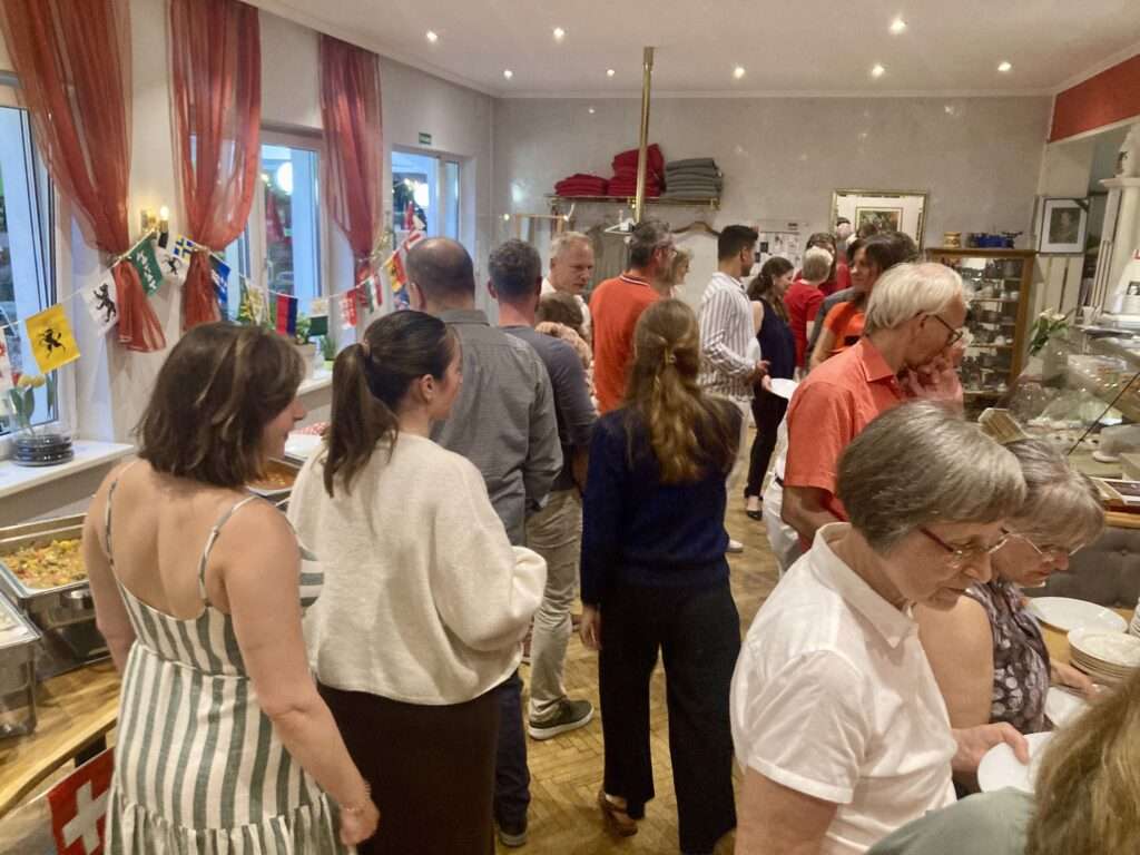 Die 1. Augustfeier 2023 fand beim Heurigen Schübel-Auer in Nussdorf statt. Nach dem sonnigen 1. August im Vorjahr mussten wir dieses Jahr allerdings wieder den Regenschirm einpacken. Trotzdem fanden sich über 90 Mitglieder und Gäste ein. Erstmals dabei war unsere Botschafterin, Frau Salome Meier, die eine kurze, prägnante Ansprache hielt. Dem einmal mehr ausgezeichneten Buffet sprachen alle Mitglieder kräftig zu. Nach Einbruch der Dunkelheit hatte der Regen aufgehört, sodass man für die anwesenden Kinder die Lampions anzünden und im Lichte der Kerzen im Gastgarten den Schweizerpsalm und das traditionelle “Le Vieux Chalet” anstimmen konnte, als Abschluss einer wirklich schönen und gelungenen Feier.