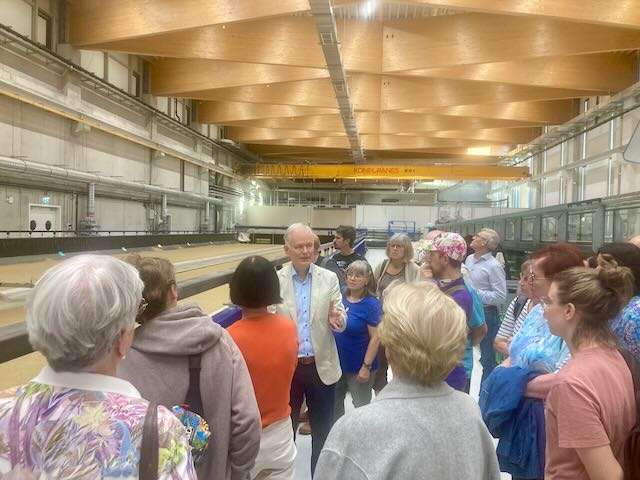 Am Freitag, 19. September 2025 konnten wir für unsere Mitglieder eine Führung durch ein weltweit einzigartiges Labor organisieren, das zwischen 2009 und 2023 geplante und gebaute BOKU Wasserbaulabor, wo es möglich ist, großmaßstäbliche Versuche bis zu 1:1 im Bereich Wasserkraft, Schifffahrt oder Hochwasserrisikomanagement naturnah abzubilden. Der Leiter des Instituts für Wasserbau, Hydraulik und Fließgewässerforschung (IWA), Univ.Prof. Dipl.-Ing. Dr. Helmut Habersack, führte die Gruppe von rund 30 Mitgliedern und weiteren Interessenten persönlich durch das beeindruckende, hochmoderne Laborgebäude. Vielen Dank auch an Suzanne Wolf für die Idee und Umsetzung des Anlasses!