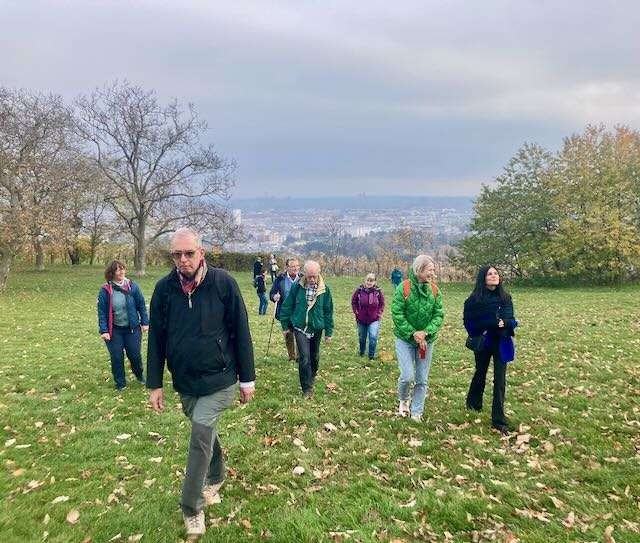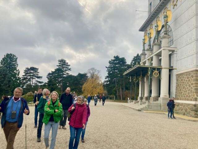 Am 5. Oktober hatte es nicht geklappt, aber am 2. November 2025 hatten wir mehr Glück und es versammelten sich immerhin 13 wanderfreudige Mitglieder, um von der U-Bahnstation Ottakring aus hinauf auf den Wilhelminenberg mit seiner hohen Aussichtswarte (auf die sich nicht alle hinauf trauten) und über die Steinhof-Gründe und mit der beeindruckenden Otto Wagner-Kirche zu wandern. Auch wenn sich die Sonne leider nicht mehr blicken ließ, so entschädigte die wunderschöne Herbstfärbung des Wienerwalds…. und auch die Einkehr und die gute Bewirtung am Schluss der Wanderung im nahen Schutzhaus.